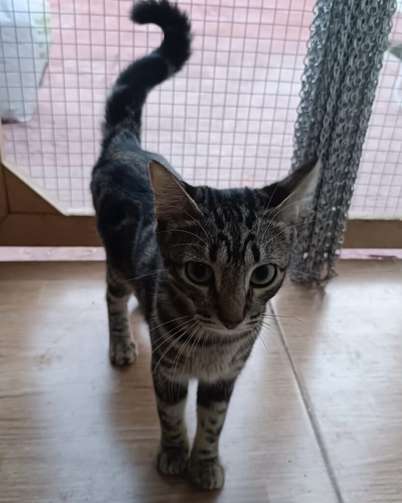 Ein aufrechter Schwanz mit kleiner Krümmung an der Spitze ist ein echtes Freundlichkeitssignal. Deine Katze ist entspannt, offen und meistens bereit für Kontakt. Kurz gesagt: Beste Laune. Seltene Gelegenheit. Nutzen.