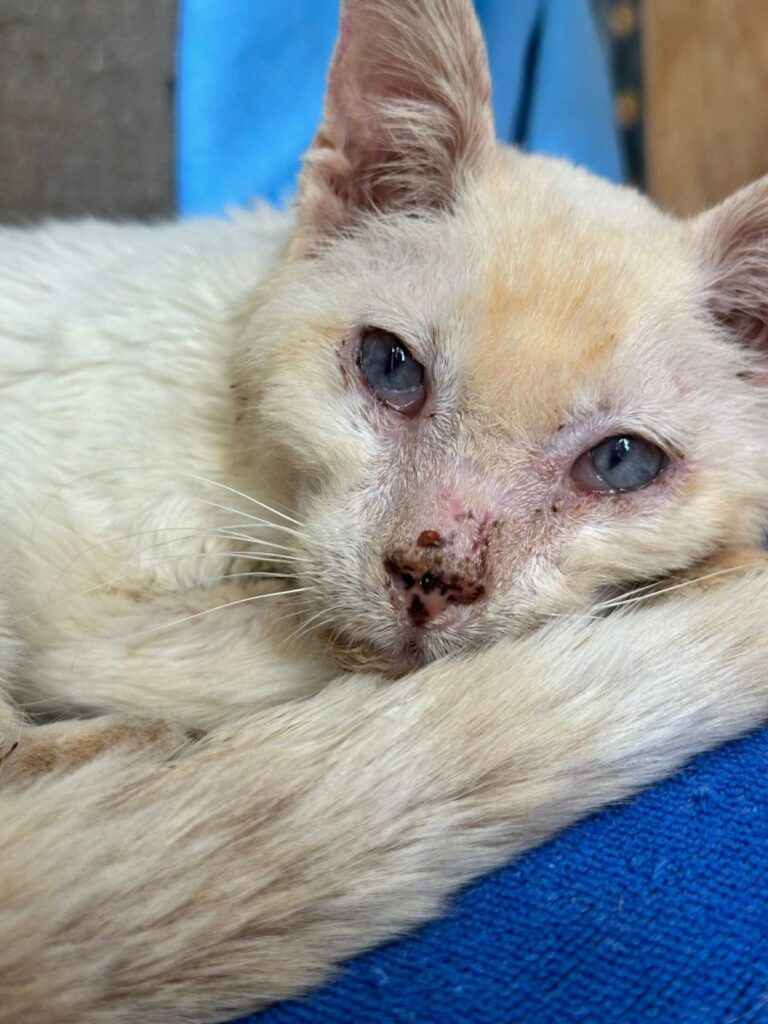 Geronimo wurde von Urlaubern in einem erschütternd schlechten Zustand gefunden. Abgemagert, geschwächt und voller Schmerzen – dennoch hat dieser sanfte Kater nicht aufgegeben. Sein genaues Alter ist unbekannt, doch er ist bereits ein kleiner Opa.