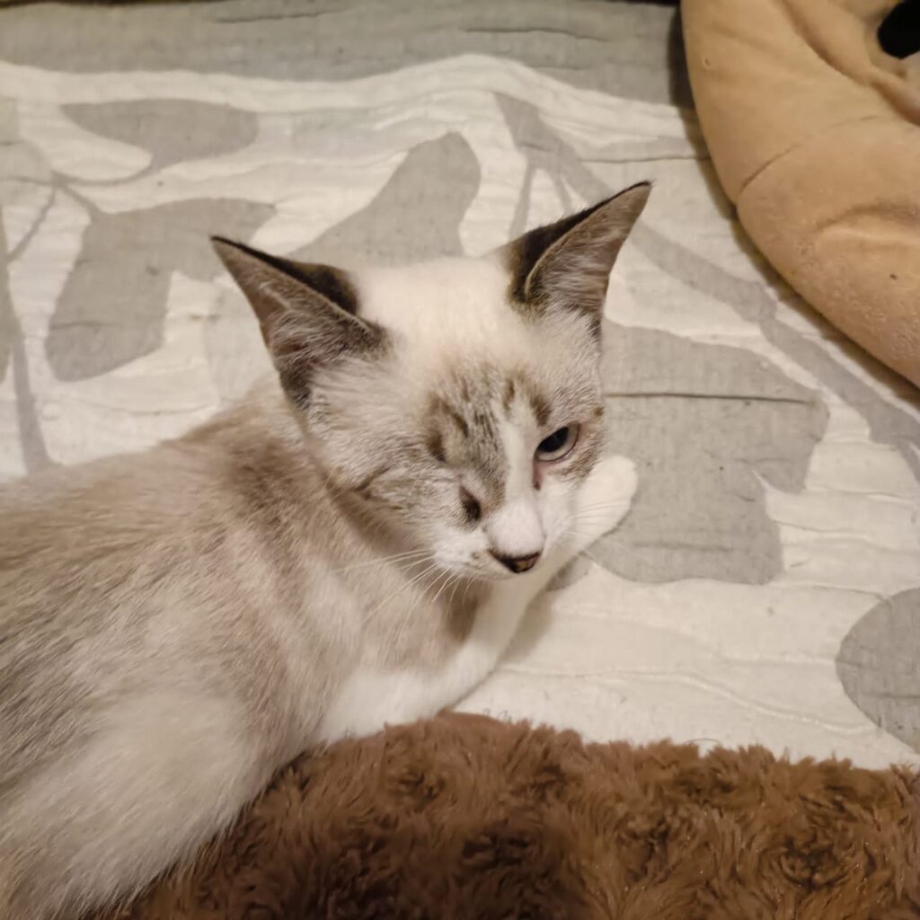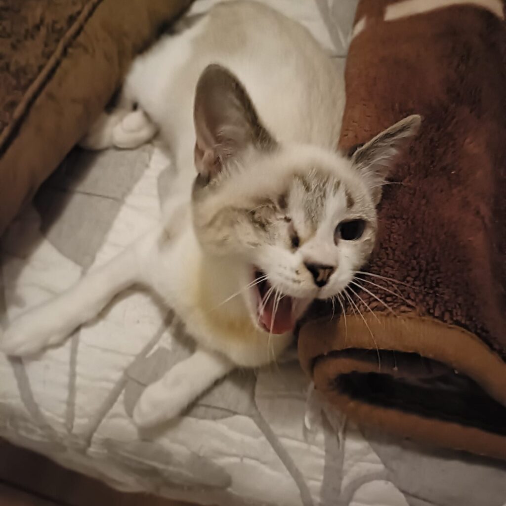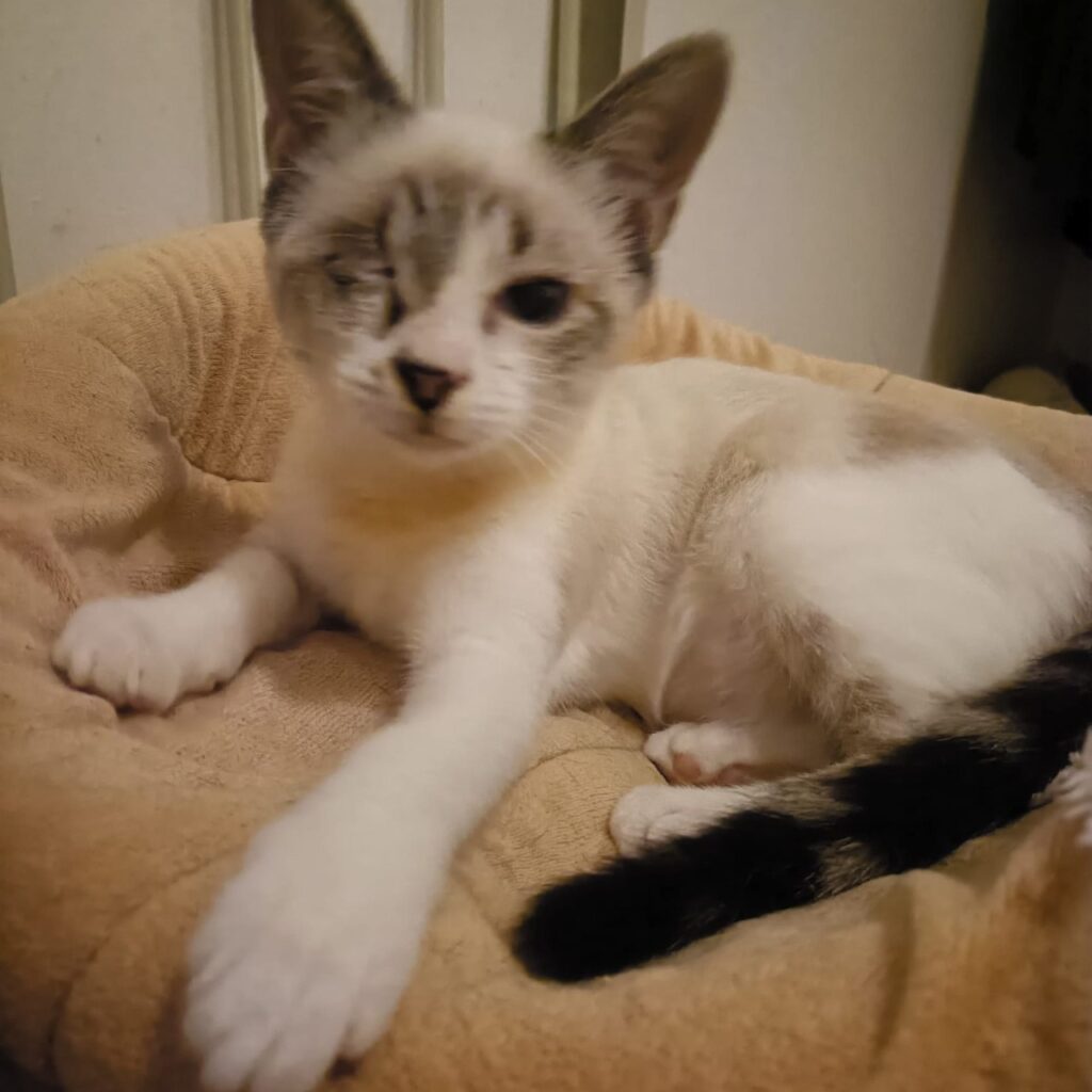 Die kleine Hope, ein zartes Siam-Mix-Kitten, wurde krank und mit stark entzündetem rechtem Auge am Hafen von Arinaga gefunden. Leider konnte ihr Auge nicht gerettet werden – es musste entfernt werden. Doch Hope hat sich tapfer durchgekämpft und ist heute wieder fit, fröhlich und voller Lebensfreude!